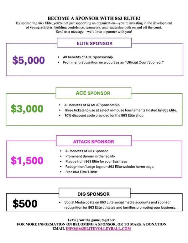 By sponsoring 863 Elite, you're not just supporting a team—you’re investing in the development of young athletes, building confidence, teamwork, and leadership both on and off the court.